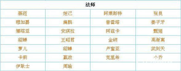 薇菈对应妲己,阿莱斯特对应张良,穆加爵对应扁鹊,普雷塔对应姜子牙,娜塔亚对应安琪拉,阿兹卡对应甄姬,貂蝉对应王昭君,金纳对应高渐离,萝儿对应貂蝉,卢蜜亚对应武则天,卡莉对应嬴政,克里希对应小乔,伊耿士对应周瑜。