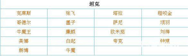 克莱斯对应张飞,塔拉对应程咬金,哥德尔对应墨子,萨尼对应项羽,牛魔王对应廉颇,欧米茄对应刘禅,美娜对应白起,夸克对应钟馗,朗博对应牛魔。