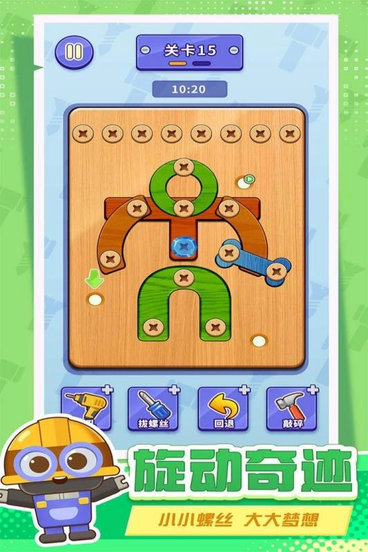 打螺丝拧不住拔钉子游戏是一款轻松简单的卡通休闲游戏,实际玩法并非拧螺丝而是拔钉子。游戏中,玩家会看到各种被钉子固定的物品,需要借助空白空洞移动钉子,最终完成所有钉子的拔除,以此推进关卡。虽然玩法简单,但关卡难度不低,稍有失误就可能导致操作锁死,因此玩家需谨慎操作。游戏内设有四种道具,可助力玩家更顺利地拔钉子、通关。