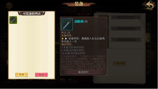 穿戴装备可明显提高武将属性,能通过强化装备强化装备特性,强大的装备特性,往往能打出出其不意的关键效果