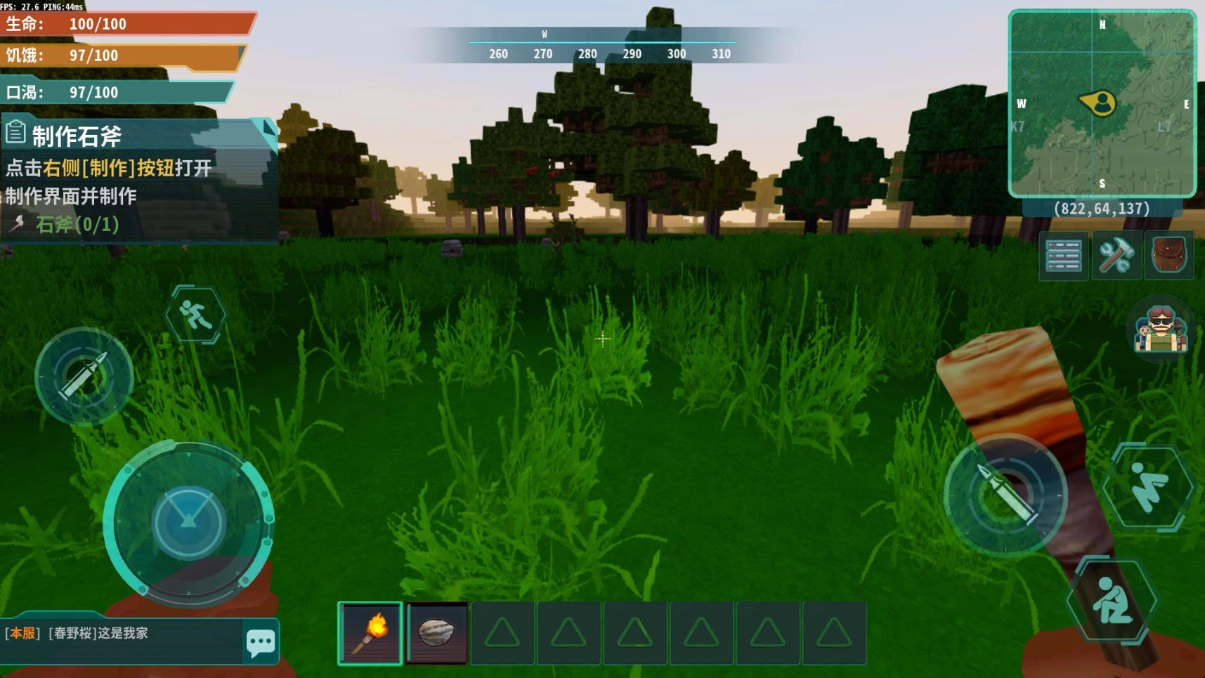 7、把屏幕中心对准不同方块,点击攻击按钮就能将其击碎,击碎方块后即可获取材料。