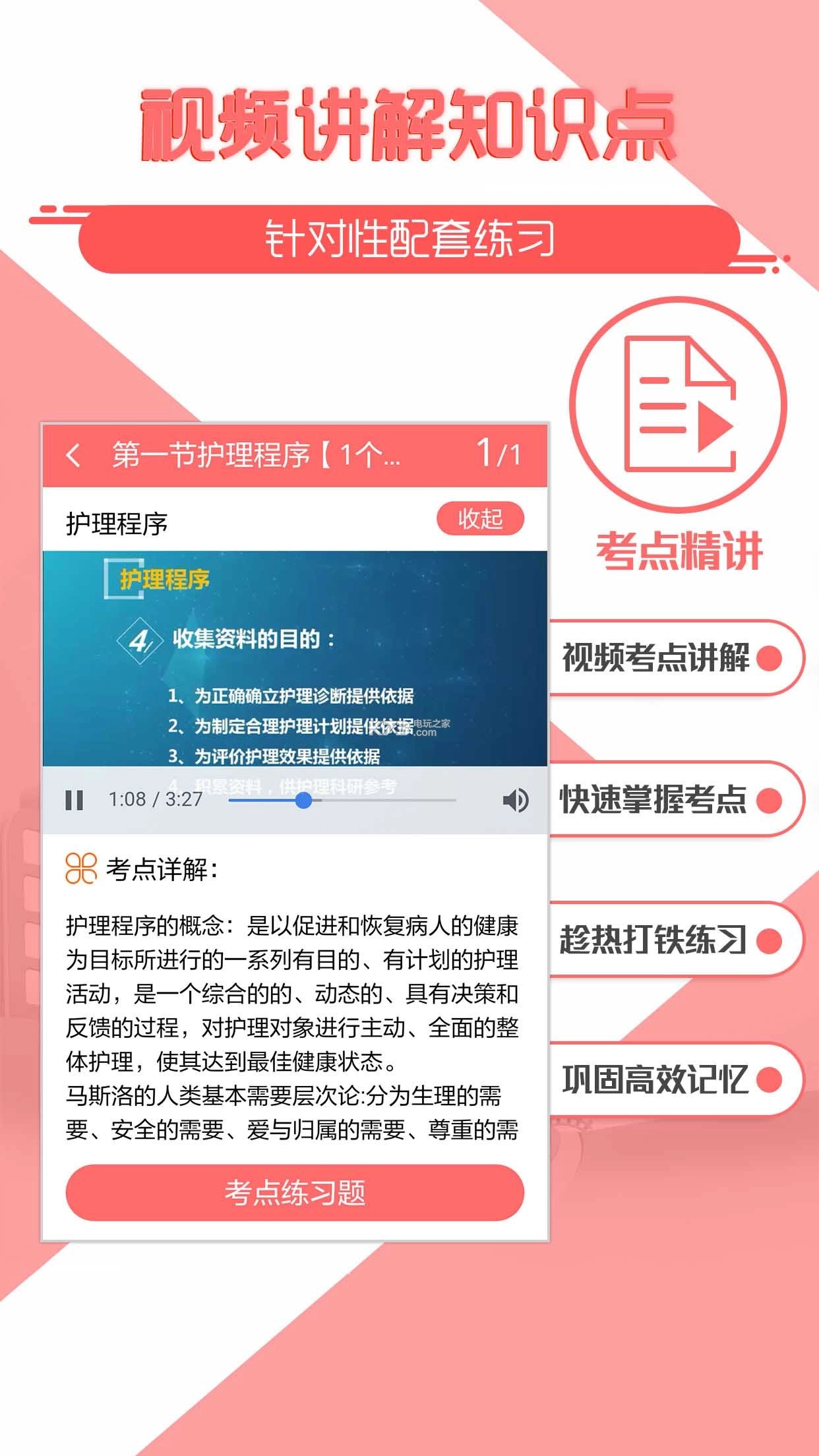 【优势学习模块 - 为护考铺平道路】考点精讲:创新学习三部曲,包含名师微视频精讲、讲义教材详解以及专项试题训练,节省 50%复习时间,打破传统学习模式,2017 年开启更高效、省时、便捷的学习方式。智能测评:通过智能学习评测掌握程度,依据测评结果针对性攻克易错易混淆题目。护考直播间:名师在线直播核心课程,打造趣味课堂,轻松学习,干货源源不断。