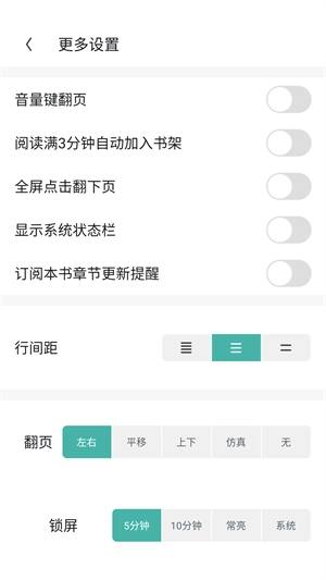 4、点击更多设置可以对于翻页方式、行间距、锁屏等等进行设置。