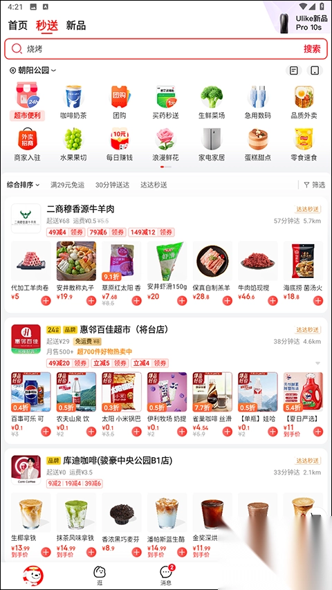 2、细分条目一目了然:于京东APP的“秒送”频道里,用户能够清楚看到外卖、咖啡奶茶、买药秒送、生鲜菜场、急用数码、水果果切等细分条目,方便用户迅速找到所需商品。