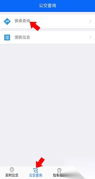 4、若要查询换乘线路,点击【公交查询】-【换乘查询】即可。