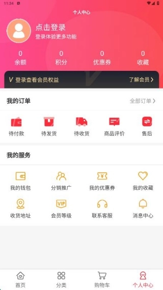 4、个人中心则展示了余额、积分、优惠券、我的订单等许多功能,优化购物服务。